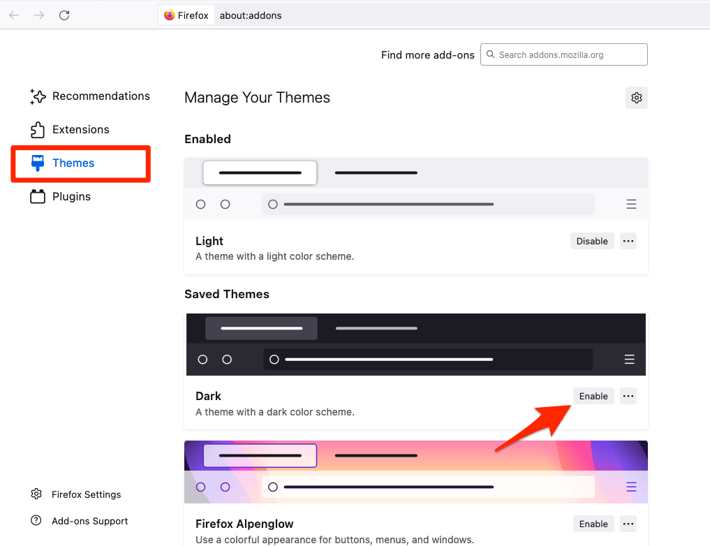 It allows you to choose between Dark or Light mode themes, or you can download and install any color theme from the themes and add-on store to apply.