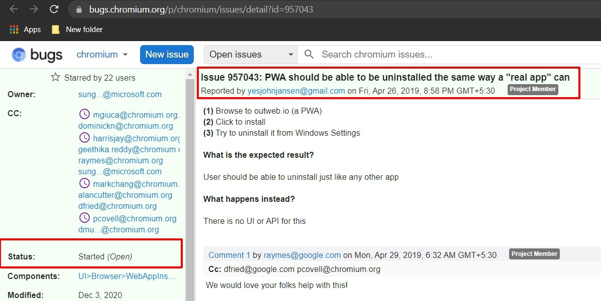 On the Chromium Bugs page, there’s an active issue titled ‘PWA should be able to be uninstalled the same way a “real app” can.‘