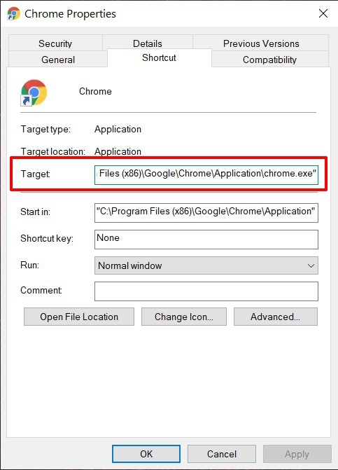 - Go to its Shortcut section and check out its Target field. It should spell something along the lines of: