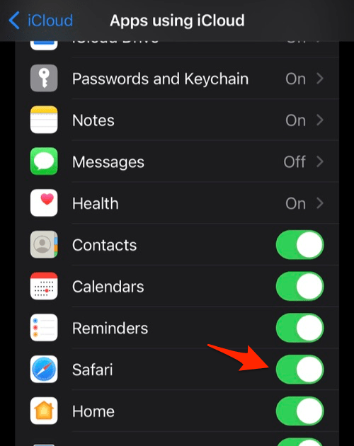 - Scroll down to the Safari app and ensure the toggle button is enabled for synchronization.