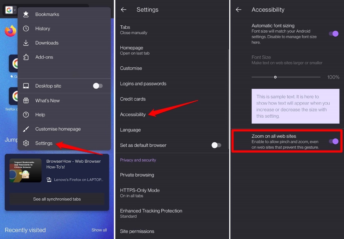 To bypass the zoom restriction, you can enable the ‘Zoom on all websites’ toggle switch under accessibility settings in the Firefox app.