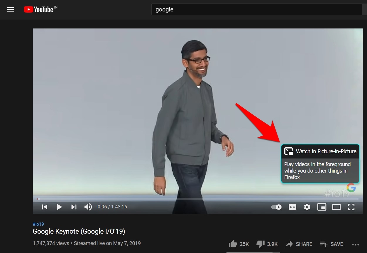 3. Click on the Watch in Picture-in-Picture icon on the right inside the video.