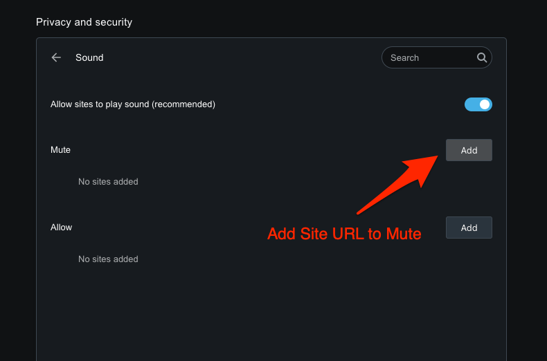 Similar to the mute section, as mentioned previously, you can add websites in the Allow section to enable specific sound access for them. Click on the button and enter the URL to allow sound permissions.