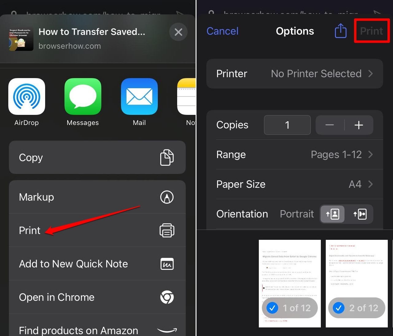 - Select the Print menu and then tap on the Share