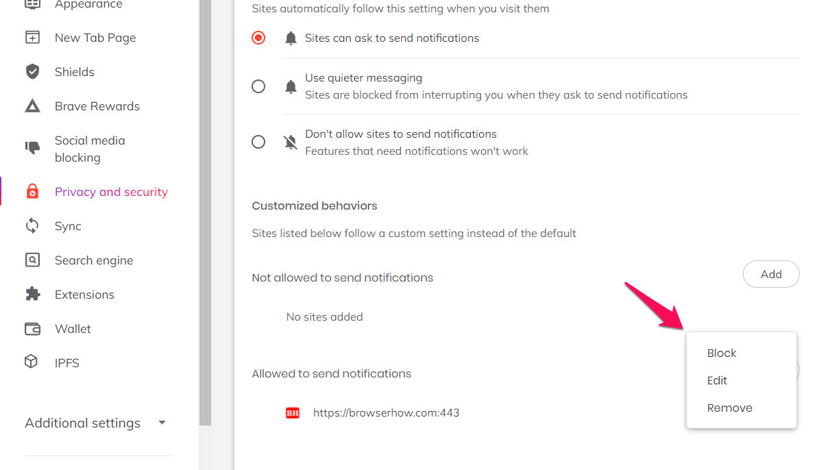 The Brave browser will respect your settings, and you can further customize the notification options from the same Site settings page.