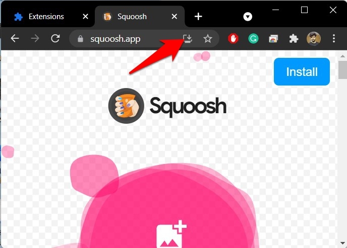 Head over to your website and then click on the Install icon situated at the extreme right of the address bar (for reference, let’s take Google’s Image Compression website Squoosh)