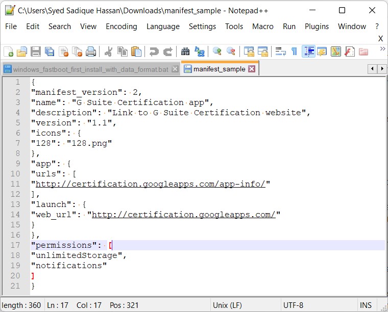After that, you must code and create a manifest file within that folder. Use a text editor such as Notepad++ and create a new JSON or JavaScript Object Notation file.