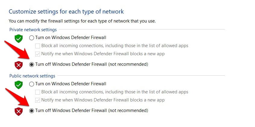 3. Select Turn off Windows Defender Firewall under the Public and Private network sections.
